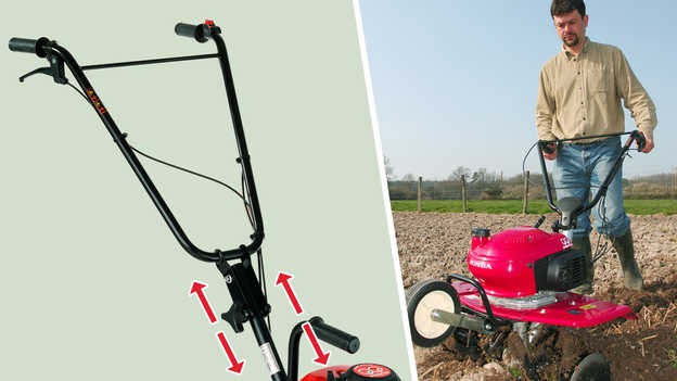 | Ergonomicky navrhnutá rukoväť s prehľadne umiestnenými ovládacími prvkami sa dá jednoducho sklopiť bez použitia náradia. Tento praktický systém uľahčuje skladovanie a prepravu kultivátora, pričom zaberie minimum miesta v garáži či v úložnom priestore. |